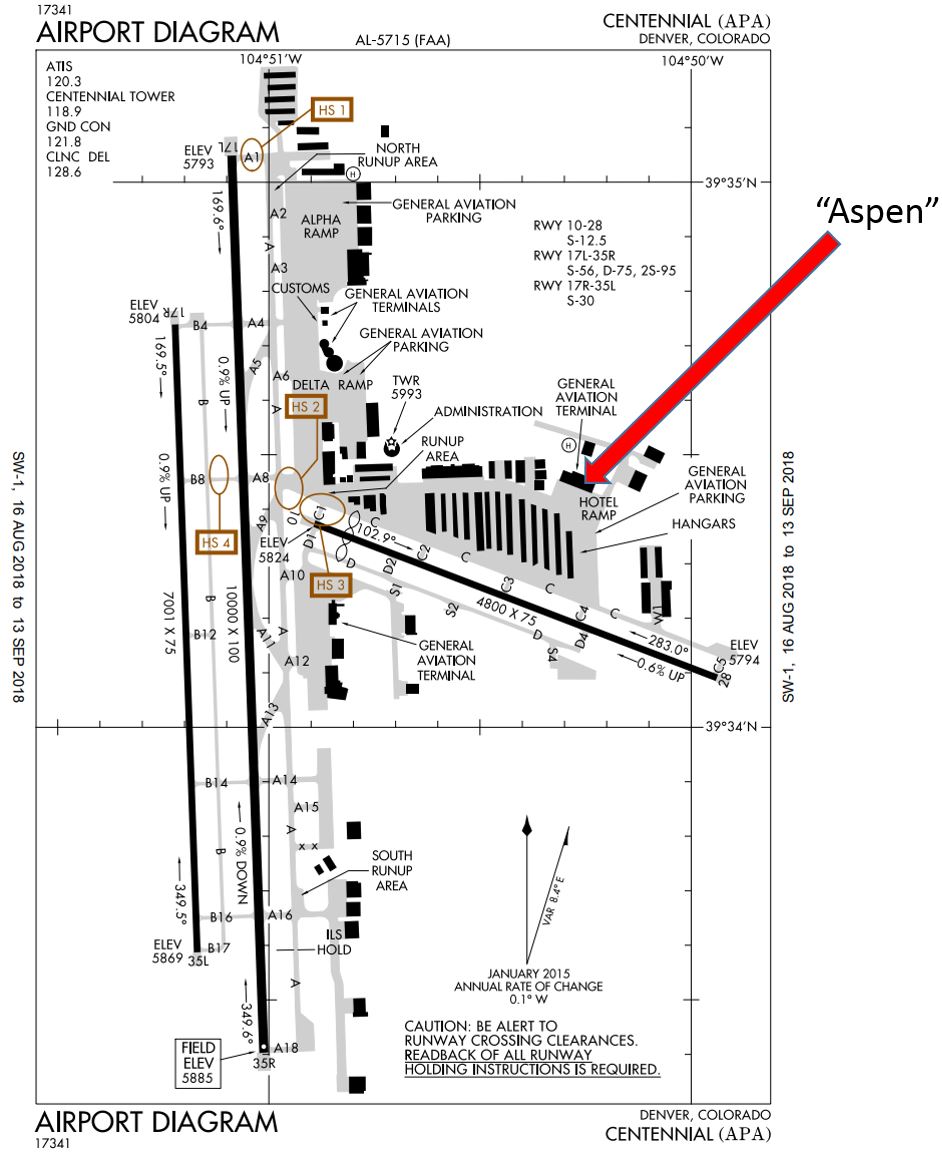 Question along the same lines. I learned to fly at (what is now) the Aspen Flying Club, which occupies part of a large building on KAPA, and generates quite a bit of GA traffic. IIRC it's usual to start with "Centennial ground, Gobosh 123YZ at Aspen with etc. etc." Would the controller recognize the location? I've attached a jpg for reference.