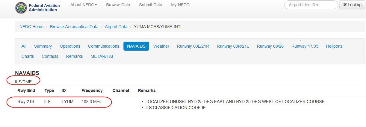 12 32.64682200 -114.61343600 193 10830 18 0.000 IYUM KNYL 21R DME-ILS Note: since the DME is referenced to NYL, the coordinates in this entry represent the location of NYL, which is located about midway between the IYUM glideslope and the IYUM localizer.